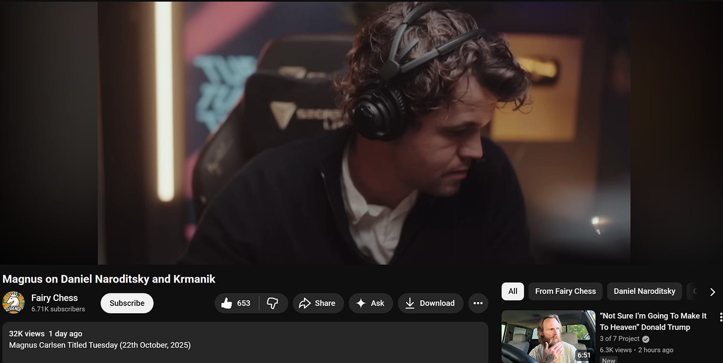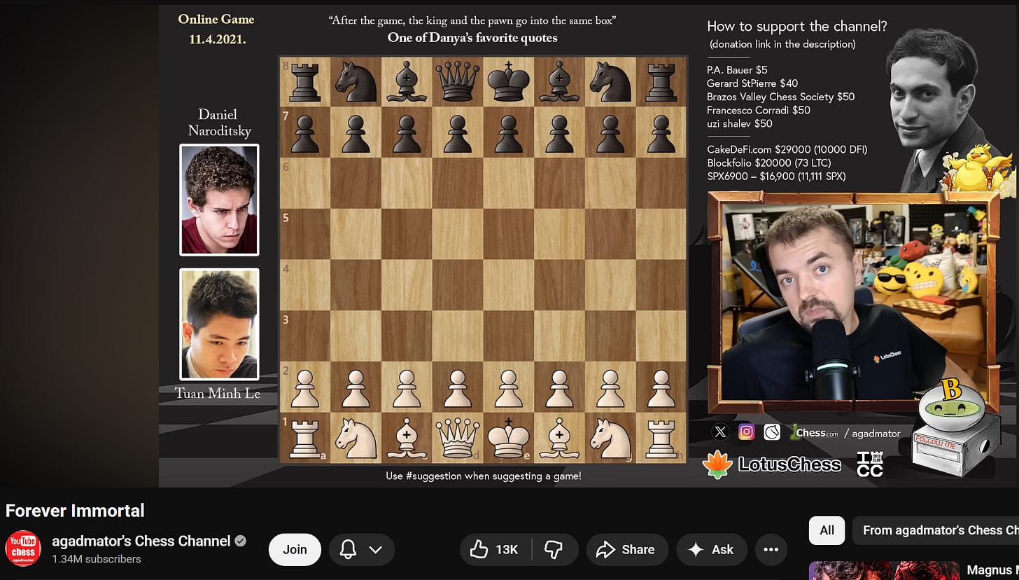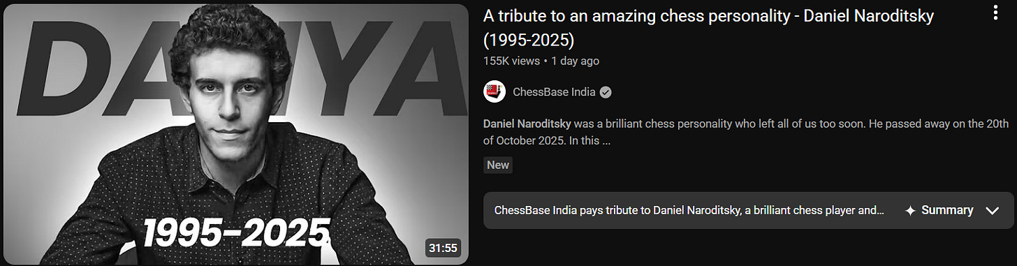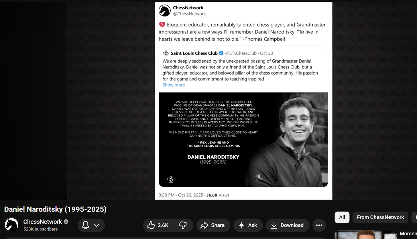 Daniel Naroditsky, or Danya, illuminated chess with kindness and mastery. A 5-time U.S. Champion and YouTube educator, his soft-spoken voice penetrated hearts and minds—never accusatory, never unreasonable, not even to a former world champion who fell from grace. Danya loved chess because he loved its people. Countless souls touched by his light, we remember him. His YouTube master classes live forever: YouTube.com/@DanielNaroditskyGM. Daniel allowed us to wonder.