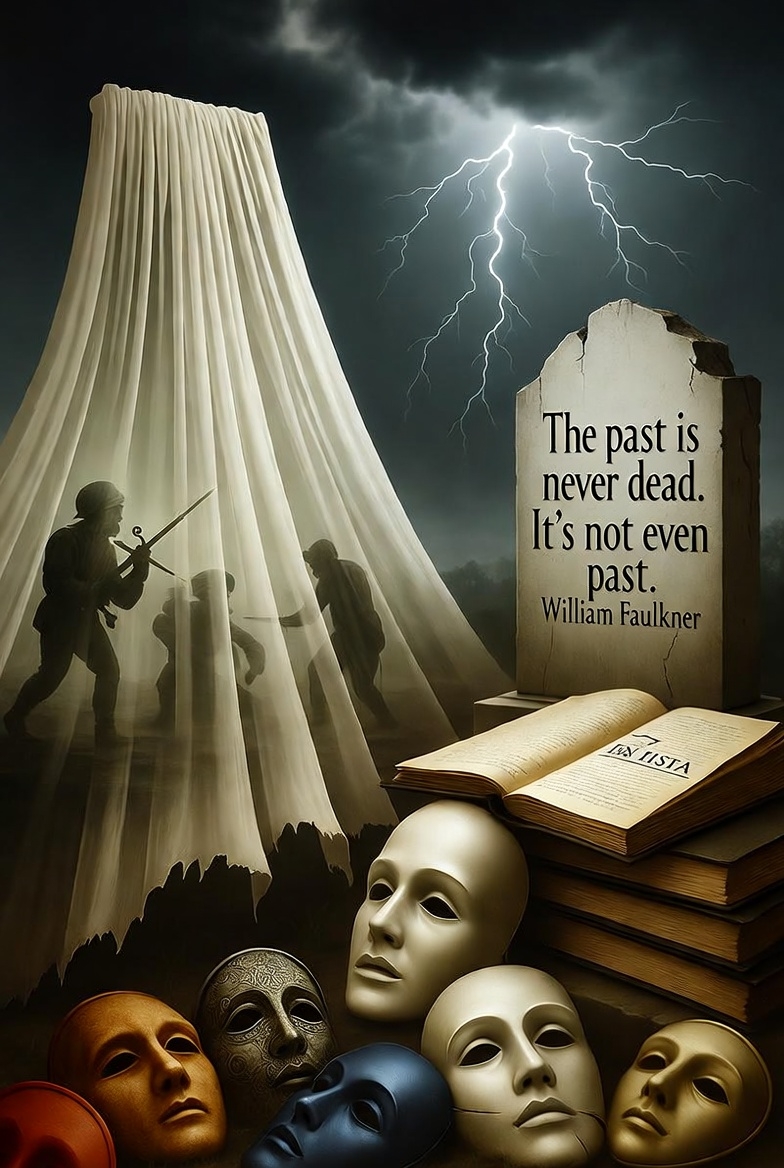 Veil tears, ledgers bleed, and Faulkner echoes—beasts gnaw bones on marble floors; history hungers, unslaked. Progress? Thieves’ grins on histories’ graves.